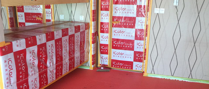 遮蔽保护:施工作业、材料堆放区域必须加盖厚度不小于1cm的泡沫卷材或块状的保护材料铺平,再使用iColor专用地面保护膜二次遮
